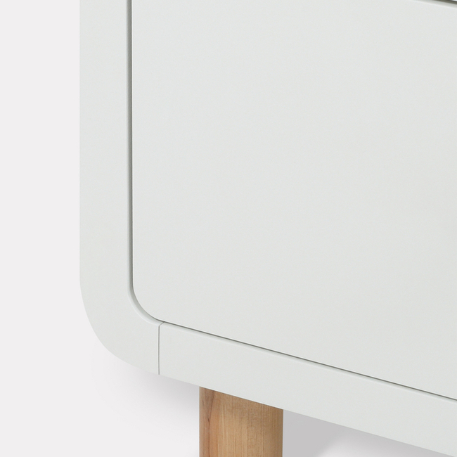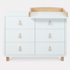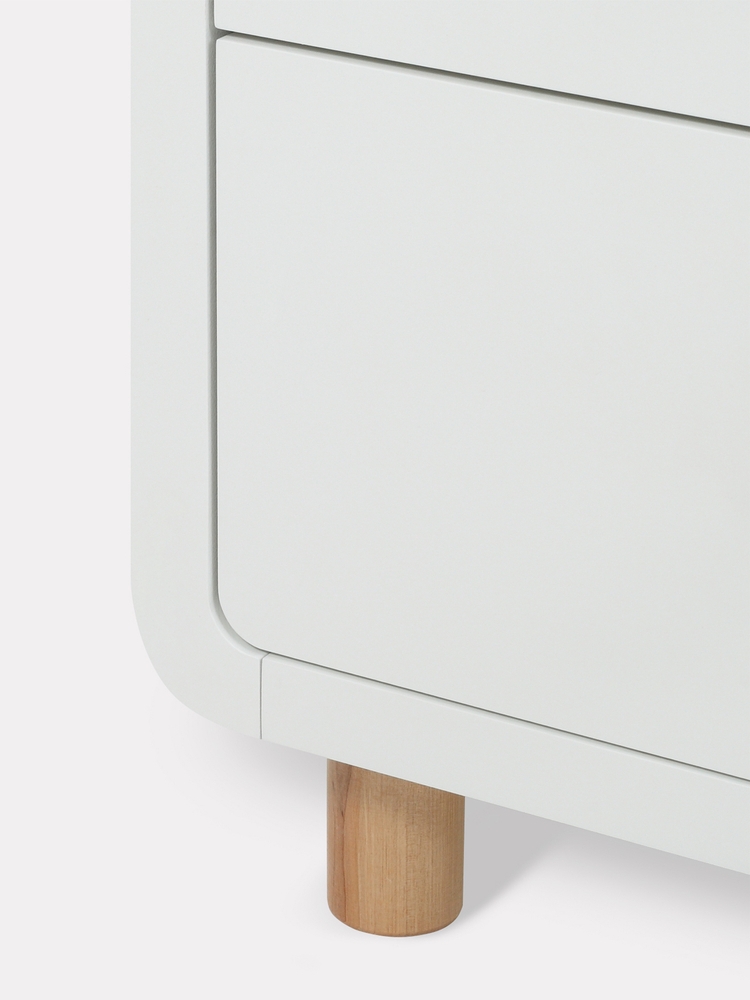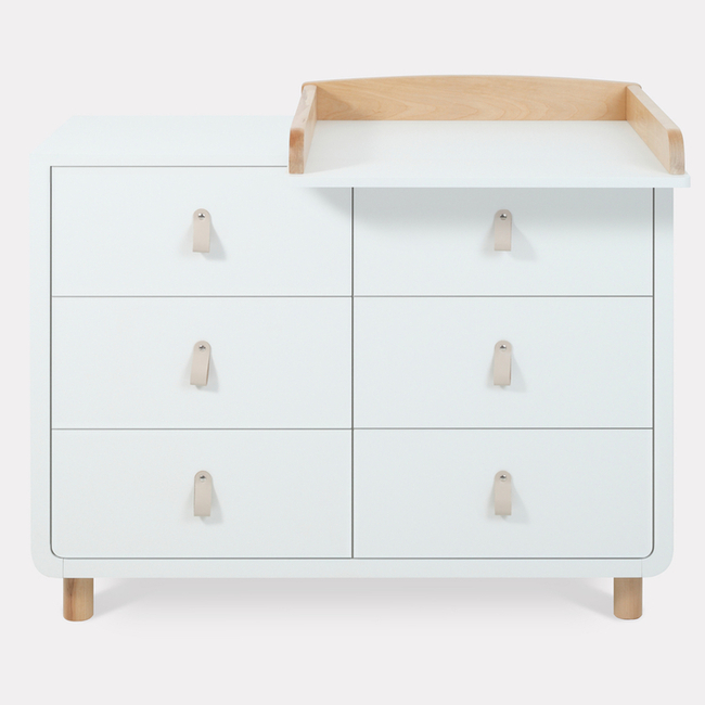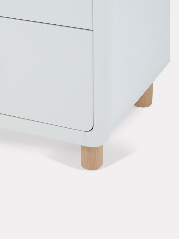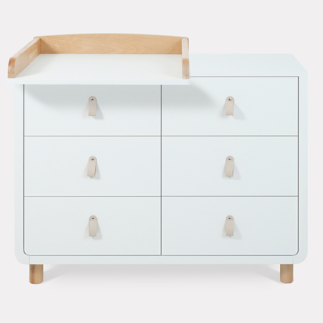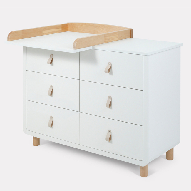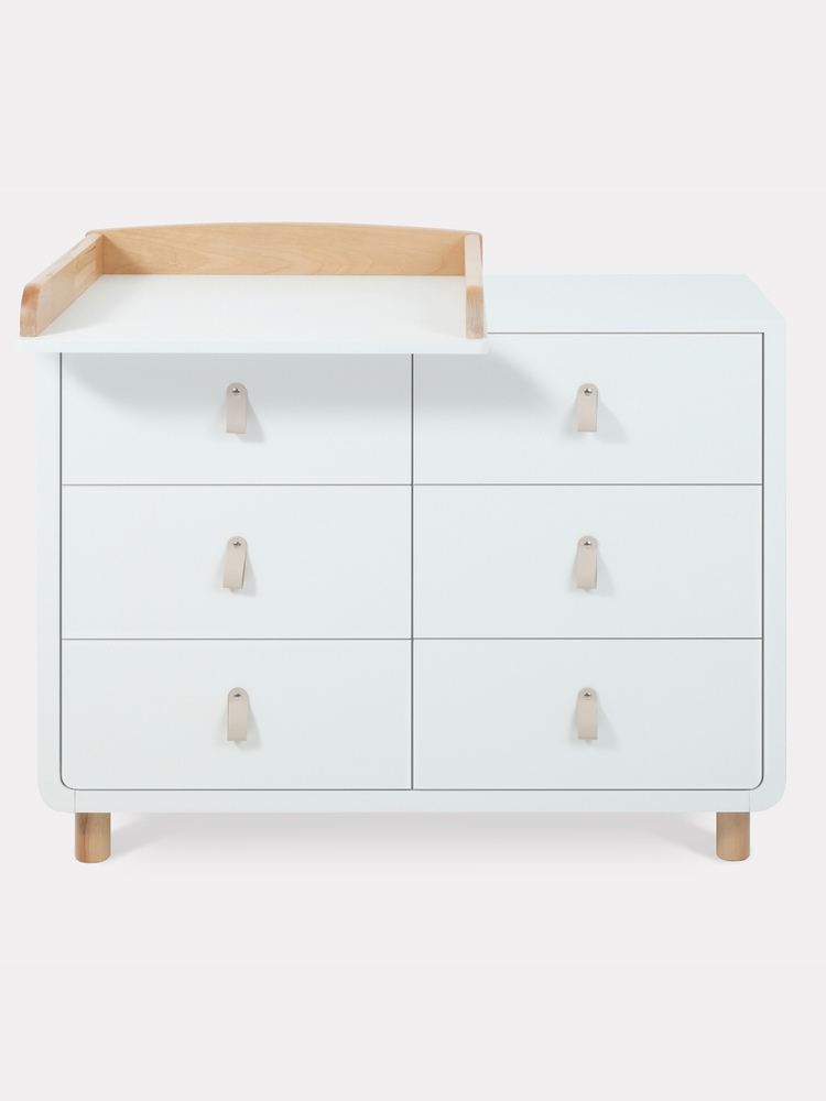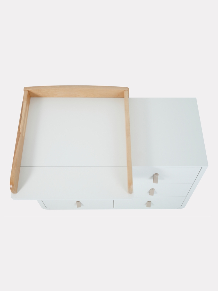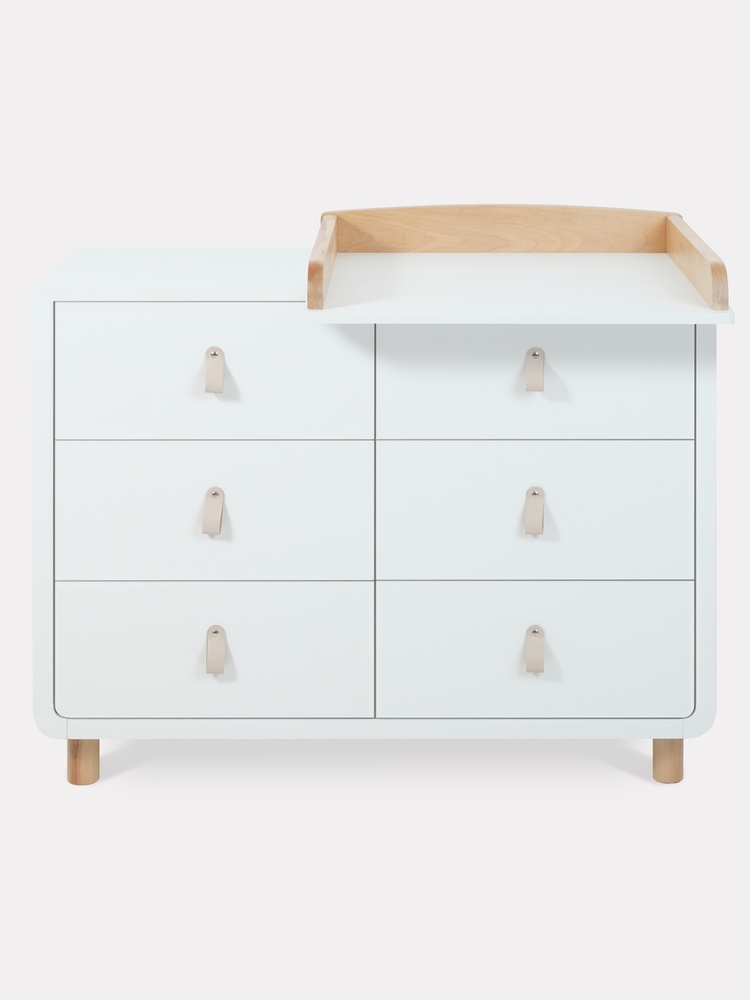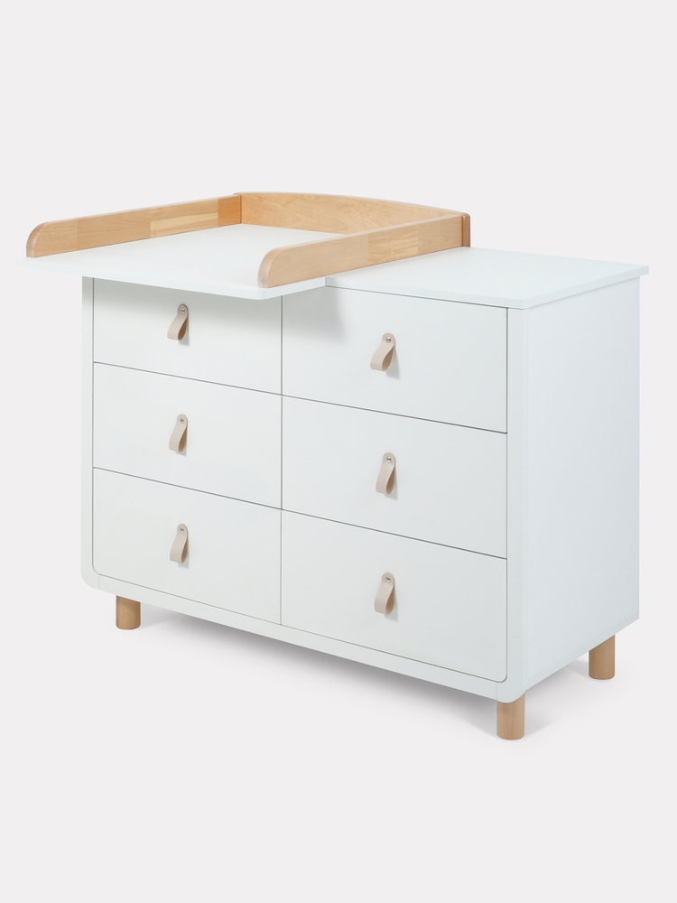 - плавные линии бортика не только рифмуются с обтекаемым фасадом комода и ножками в форме цилиндров, но и обеспечивают безопасность (старший ребенок не наткнется на острый угол пеленальной накладки)